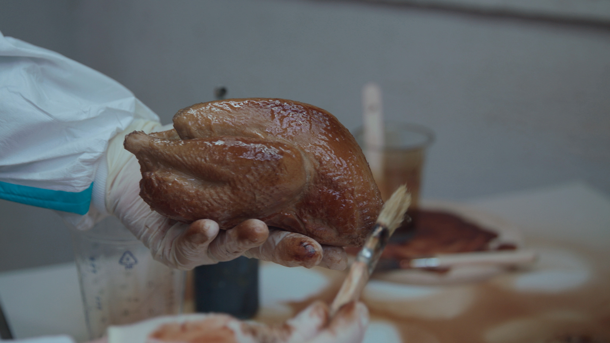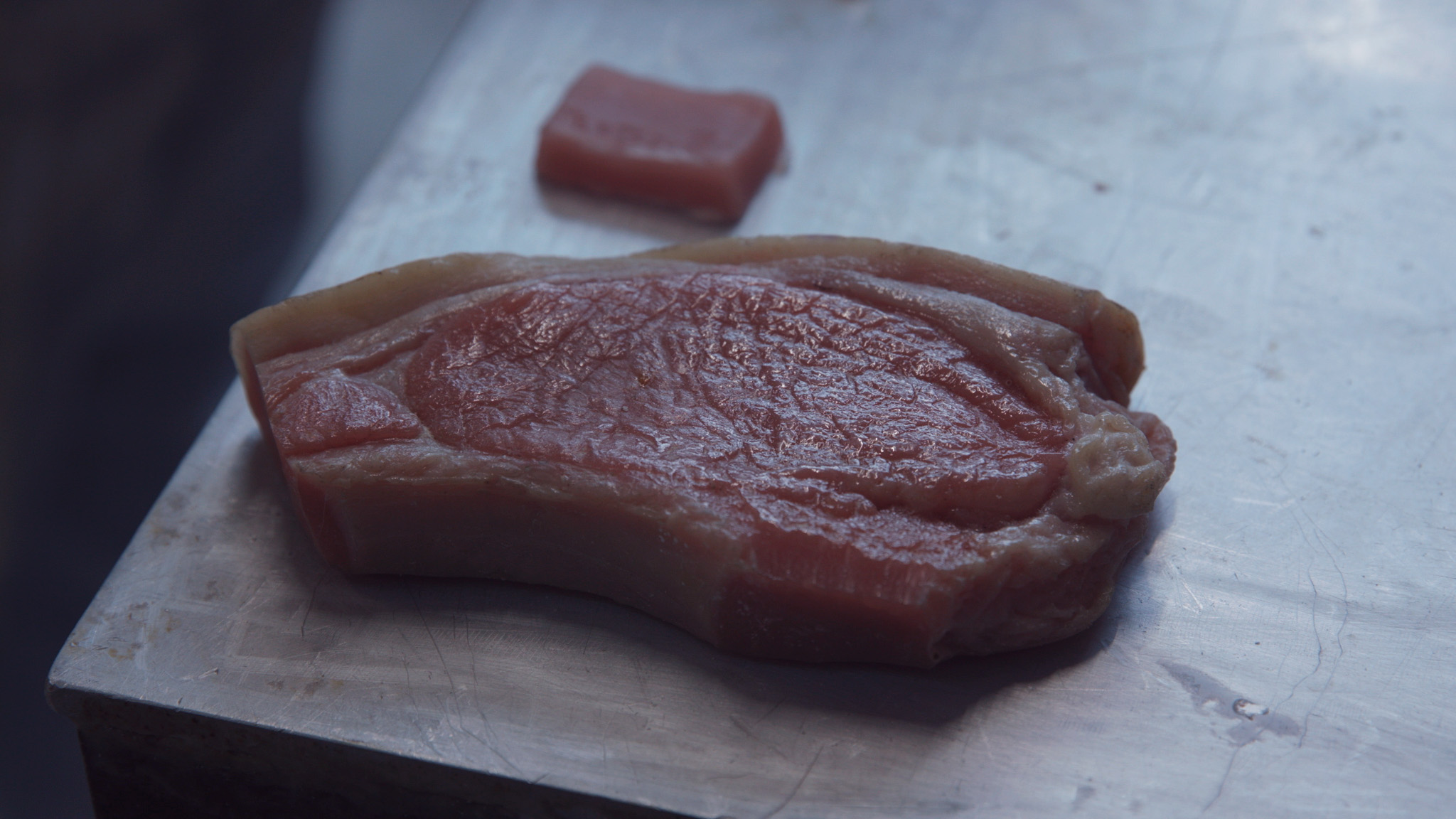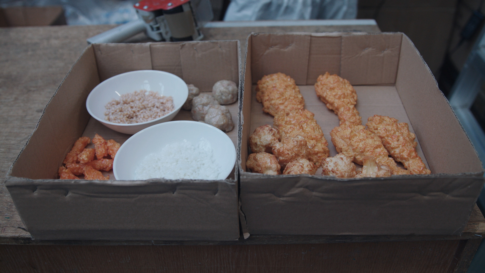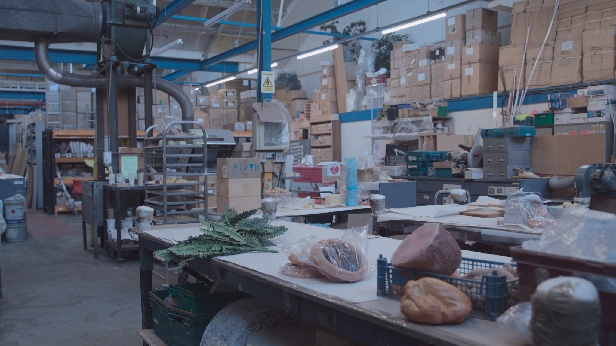 Future Foods revolves around the making of plastic food at the workshops of Replica LTD, one of the few UK based companies that still manufactures props for films, advertisements and displays. The perception of food, its appealingness and palatability through a constructed image, come into play when observing these hand-crafted manufacturing processes through a camera. A phone conversation with the CEO of a Finnish future foods' start-up introduces us to a cutting edge technology consisting of the production of a new protein generated from water, electricity and CO2 captured from the air. Solein is a new technology that speculates with a near future without agriculture and land use effects.