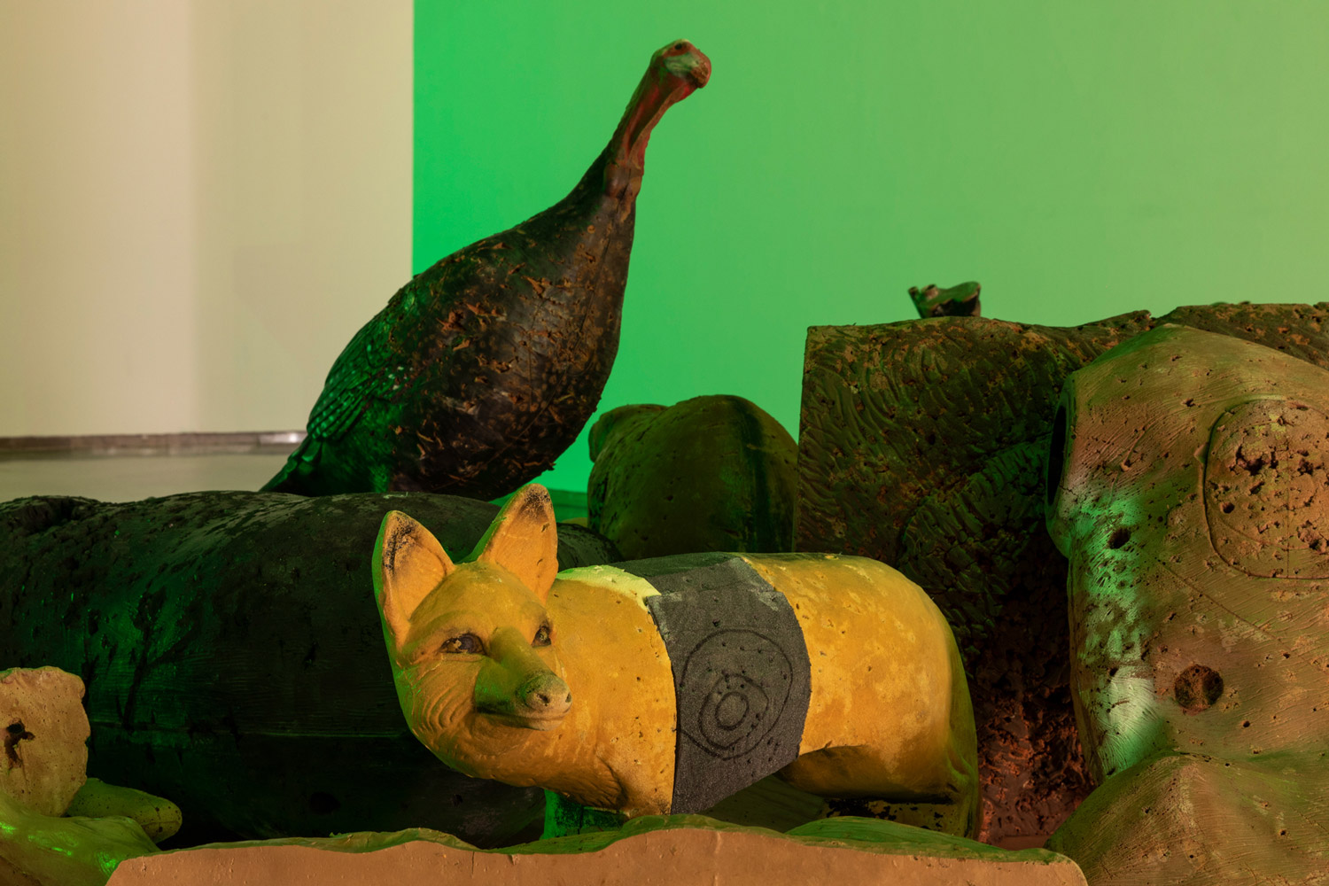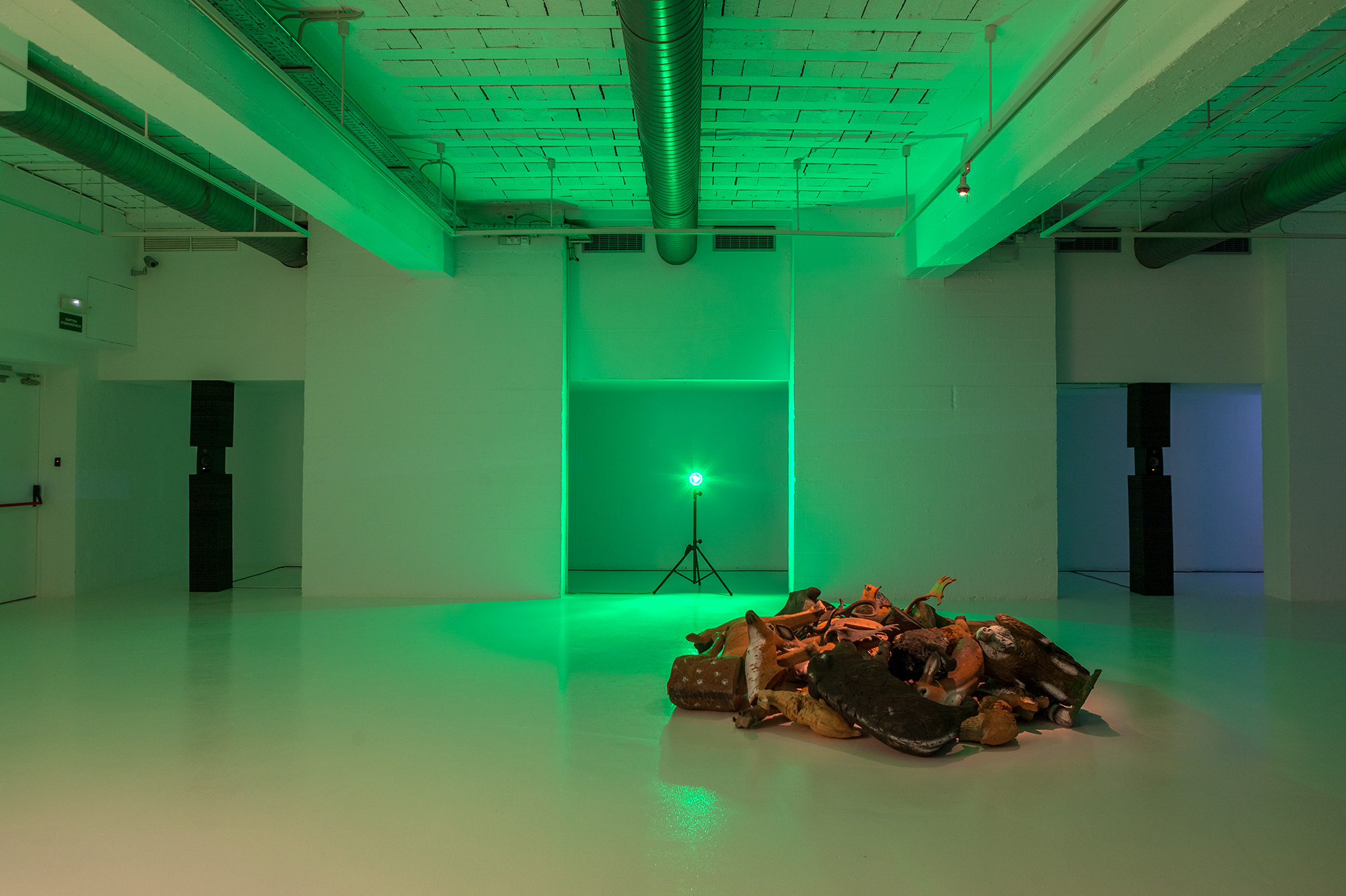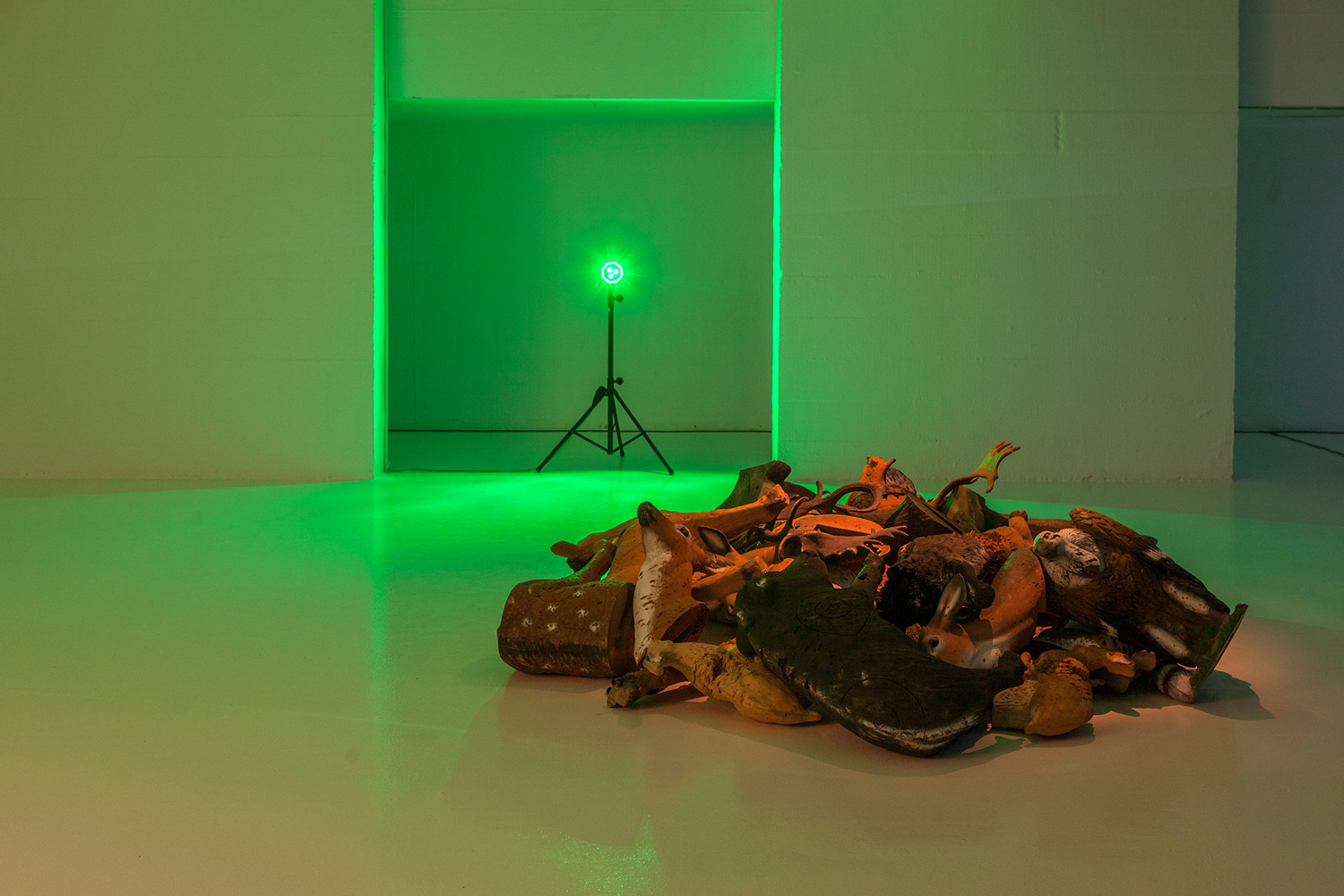 Another of the main elements in the show is a green LED light activated by a motion sensor. As the colour frequency emitted by this device is not easily perceived by many animals, it is often used in bow hunting. In the exhibition, this light introduces a new sensorial stimulus that makes reference to the perceptual thresholds of animals, and to another of Ortín’s case studies: the evolution of the figure of the archer and of the practice of archery, in parallel to that of the wolf, in these areas. One specific part of the exhibition room is set aside for a group of sculptural figures representing Iberian fauna, which are actually targets used in a kind of archery practice in which three-dimensional foam animals are scattered through a forest, with the idea of decoupling the idea of death from the practice of bow hunting. But paradoxically, the somewhat anachronic figure of the hunting archer, which also takes us back to the origins of hunting, has taken on an important role in the preserve of some ecosystems. Some regional governments hire marksmen to round up certain animals whose presence has grown too quickly and is threatening the balance of the ecosystems of protected zones or urban centres, as in the case of wild boars.