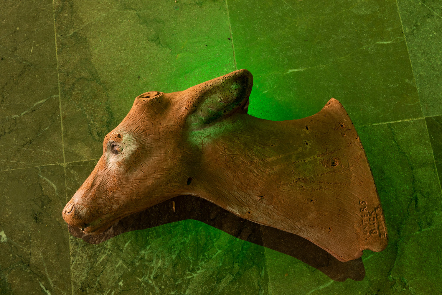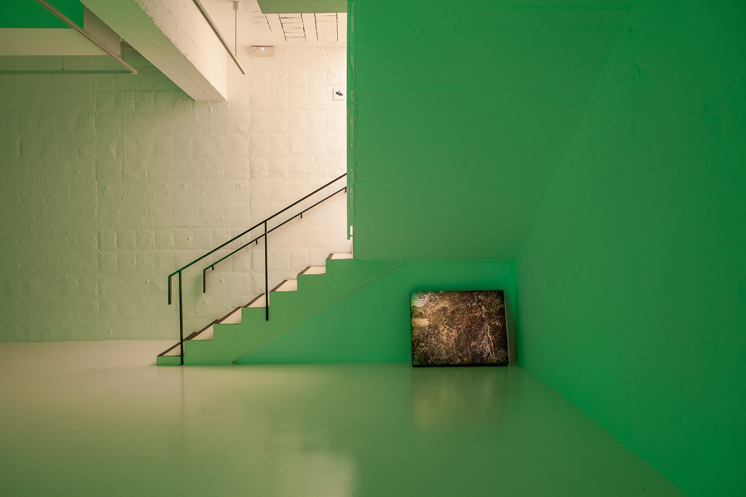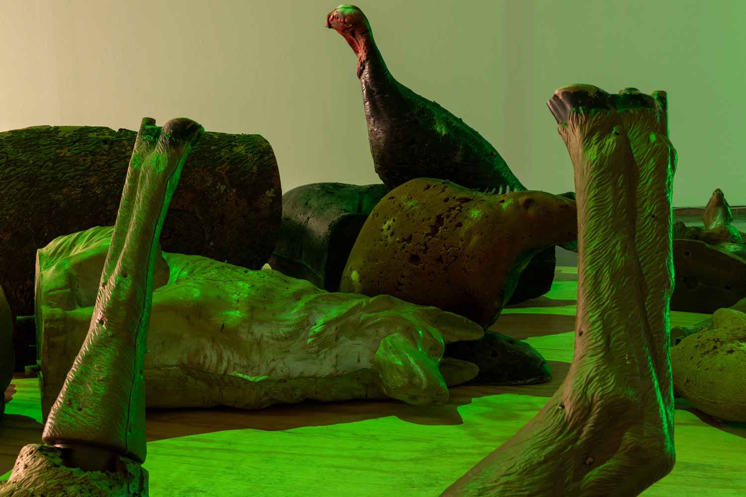 Another of the main elements in the show is a green LED light activated by a motion sensor. As the colour frequency emitted by this device is not easily perceived by many animals, it is often used in bow hunting. In the exhibition, this light introduces a new sensorial stimulus that makes reference to the perceptual thresholds of animals, and to another of Ortín’s case studies: the evolution of the figure of the archer and of the practice of archery, in parallel to that of the wolf, in these areas. One specific part of the exhibition room is set aside for a group of sculptural figures representing Iberian fauna, which are actually targets used in a kind of archery practice in which three-dimensional foam animals are scattered through a forest, with the idea of decoupling the idea of death from the practice of bow hunting. But paradoxically, the somewhat anachronic figure of the hunting archer, which also takes us back to the origins of hunting, has taken on an important role in the preserve of some ecosystems. Some regional governments hire marksmen to round up certain animals whose presence has grown too quickly and is threatening the balance of the ecosystems of protected zones or urban centres, as in the case of wild boars.