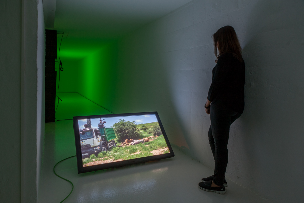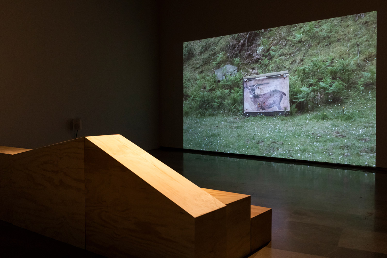 Many of the phenomena and situations explored in the four case studies reappear in a film projected on a big screen made of black foam panels (the same material used to make the 3D archery targets), placed at the end of the exhibition. Architecturally, the structure evokes the right-hand wall of a lobera or wolf trap. The film connects all the other elements that make up Reserve. It is also the part of the exhibition in which the image most clearly prevails, as opposed to the other interventions that do not privilege the visual regime and instead approach representation synaesthetically, through olfactory, auditory, and tactile stimuli. The unhurried pace and sequential progress of the film is also juxtaposed with the multiple, heterogeneous temporality of the other pieces, so that time is drawn out and unevenly paced, with breaks, simultaneity and asynchrony, contrasting with human rhythms and the conventional linearity of exhibitions. Thus, in Reserve, Ortín presents a sensory device that reveals other, less anthropomorphic ways of interacting with space that are perhaps more like those of animals and other non-human forms, and provide a perceptual and sensory, rather than conceptual, approach to the notion of the boundary.