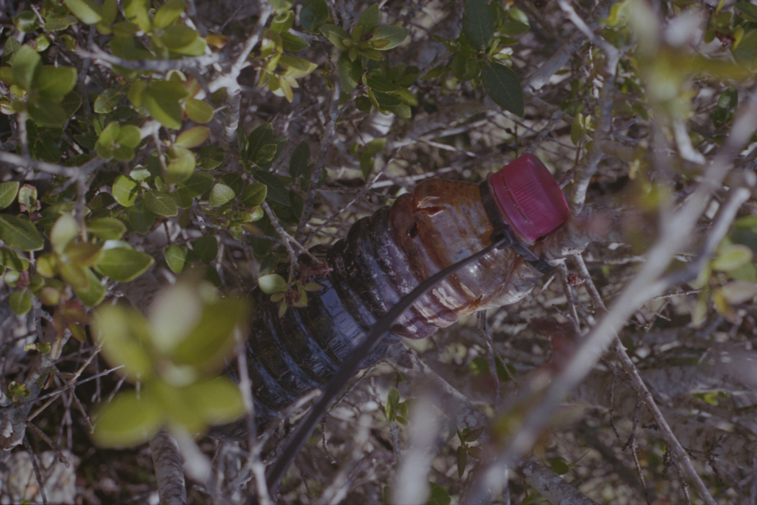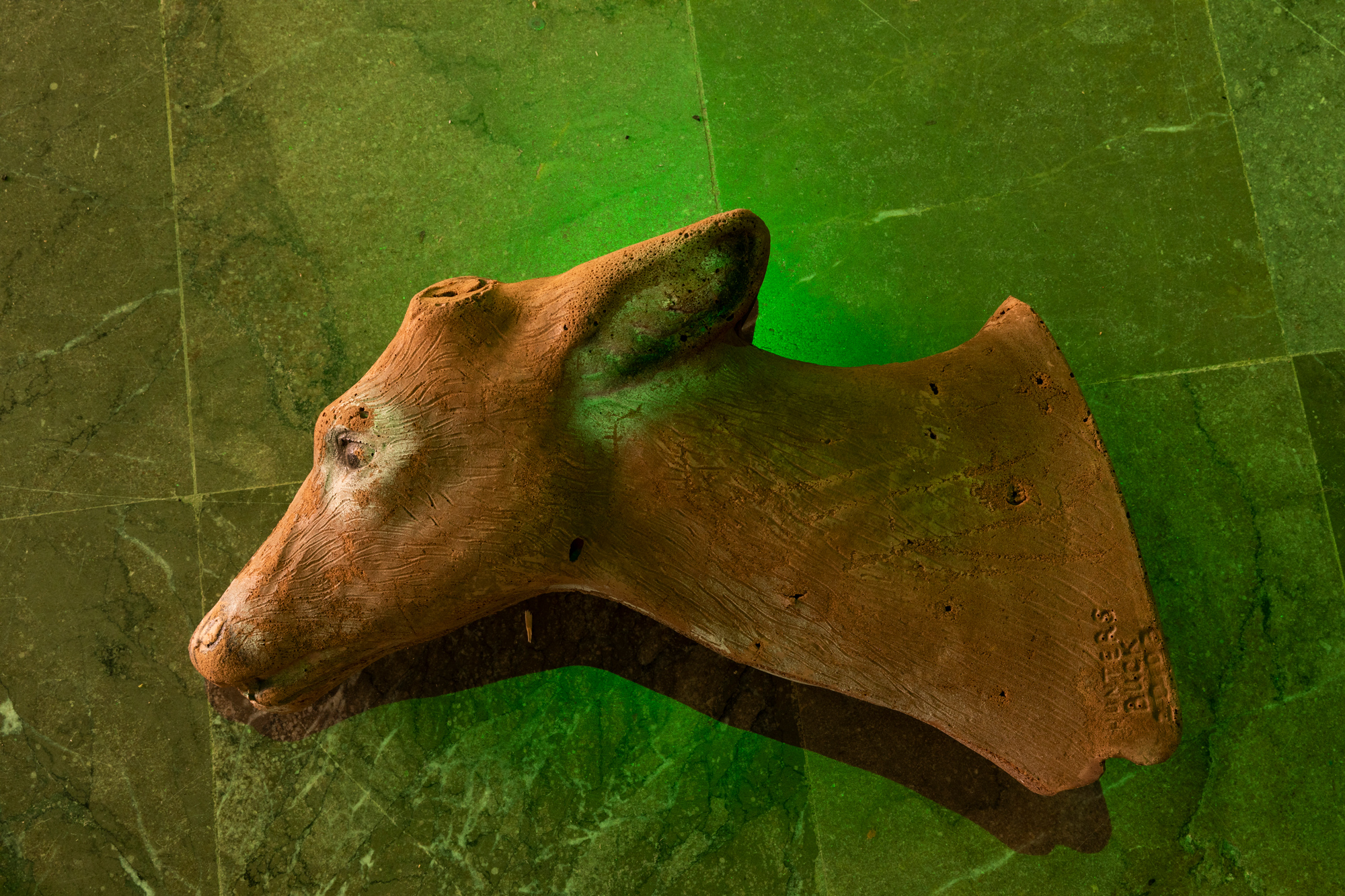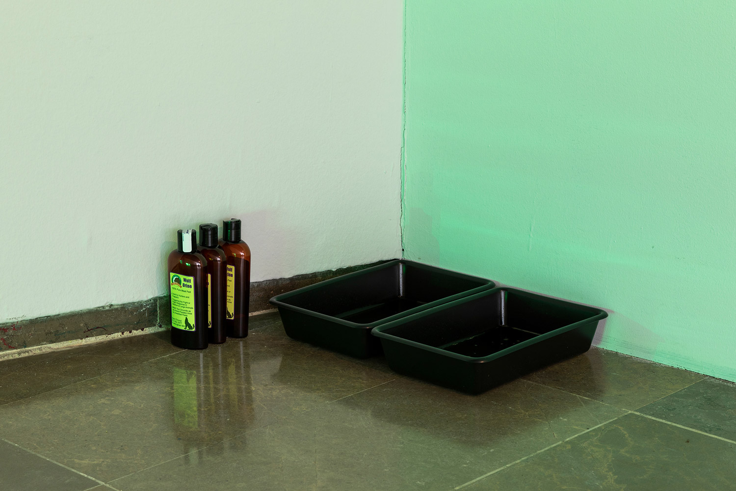 Another consequence of the absence of wolves has been the increase in the population of species that they used to prey on, such as wild boar and roe deer, and the effects of this on their habitats and behaviour. In another case study, Ortín considers the fact that the use of urine by wolves to mark their territory is now being artificially reproduced on some roadsides and crossroads, where bottled urine is used to dissuade animals from going near them. A photo placed on one of the edges of the exhibition room refers to this phenomenon, as does a large puddle of wolf urine on the floor, which introduces an olfactory stimulus and uses organic material to mark the boundaries of a specific perceptual universe – an Umwelt – that we are excluded from. Through a kind of atrophy, disorientation, or domestication of the senses, we have unlearnt the sensory aspects of this non-human signage system that we nonetheless manipulate to suit our interests.