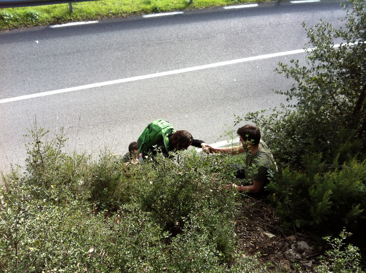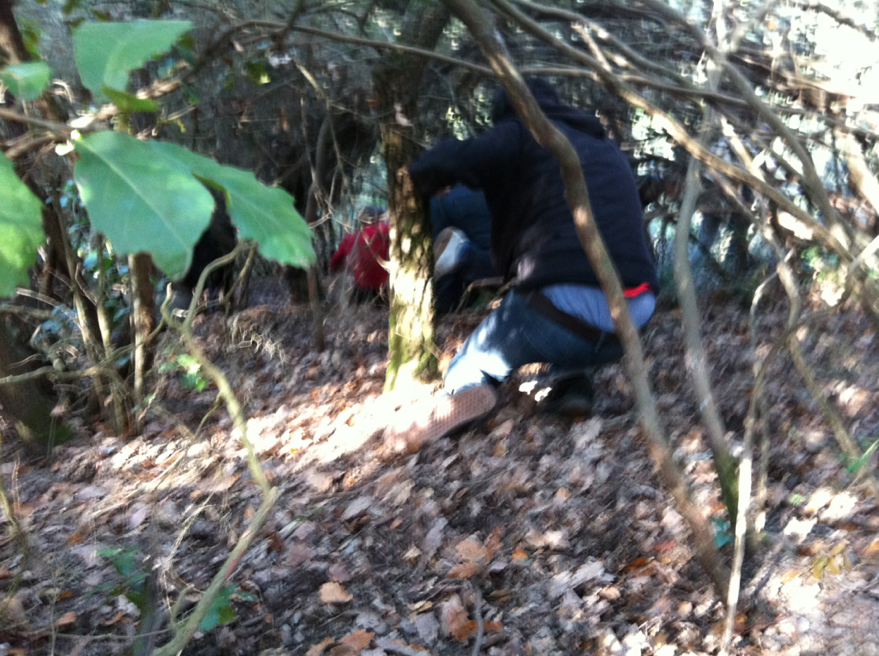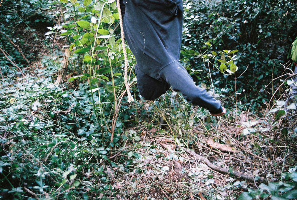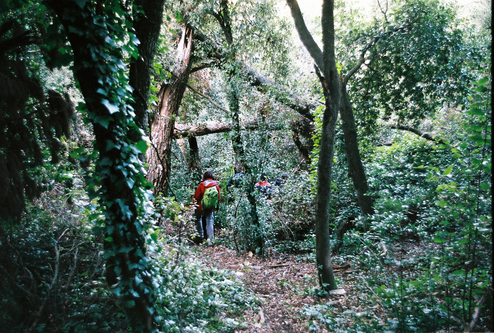 Conceived as a walk-performance, it was structured in three parts and consisted on a daytime route through the woods. At the first part, participants were invited to follow a fictionalized path where diverse interventions had been set up. From physical obstacles (fallen trunks, PVC pipes, unearthed roots, glass bottles, fungi, cans, etc.) to minimal performances (a figure hanging from a tree, the distant sound of a drum) that took place as the participants walked around. At the second part, the attendees were led through the forest’s undergrowth, where tube-shaped paths are found, mainly traced by wild boars inhabiting the area. Without a clear direction, each participant had to adapt their movements to that particular space. The last part of the route, free of interventions, was the way back to the city. The participants walked across outlying streets which returned them to the train station.