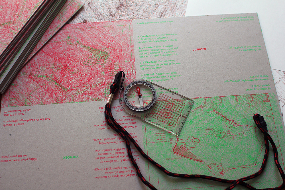 Vijfhoek consisted of a walk-performance across Diemer Vijfhoek —also known as the PEN-eiland—, a green area in the municipality of Diemen, east of Amsterdam (The Netherlands). This artificial pentagonal peninsular exists as the result of the dredging of sand during the 70’s in order to create dikes to protect the electric power plant that provided electricity to the eastern area of Amsterdam and Diemen.